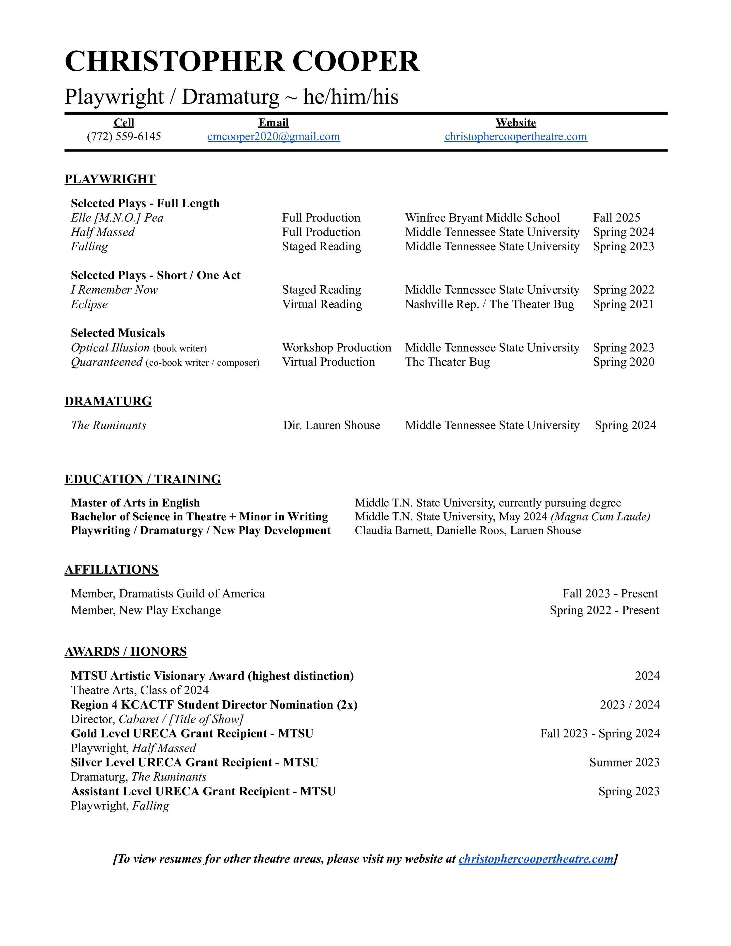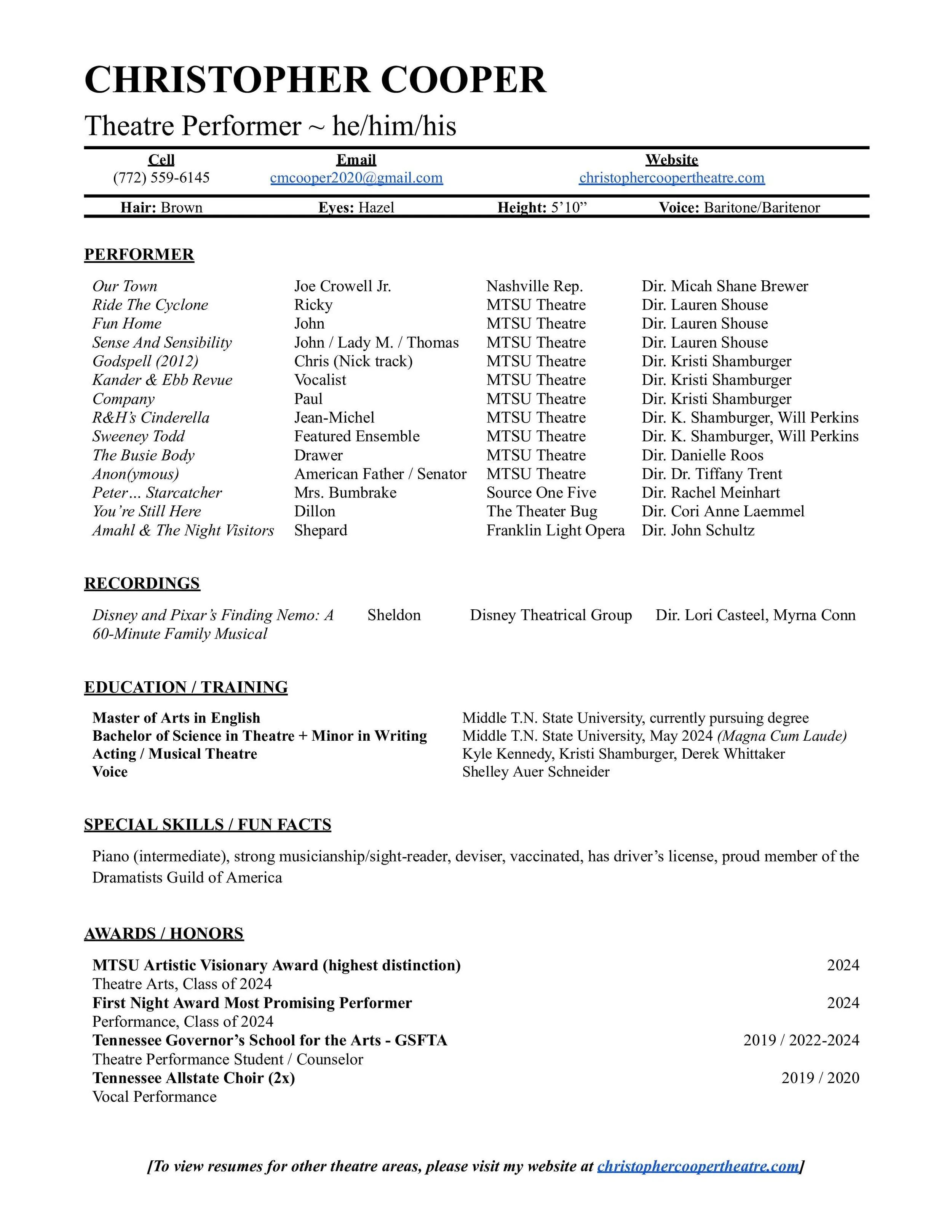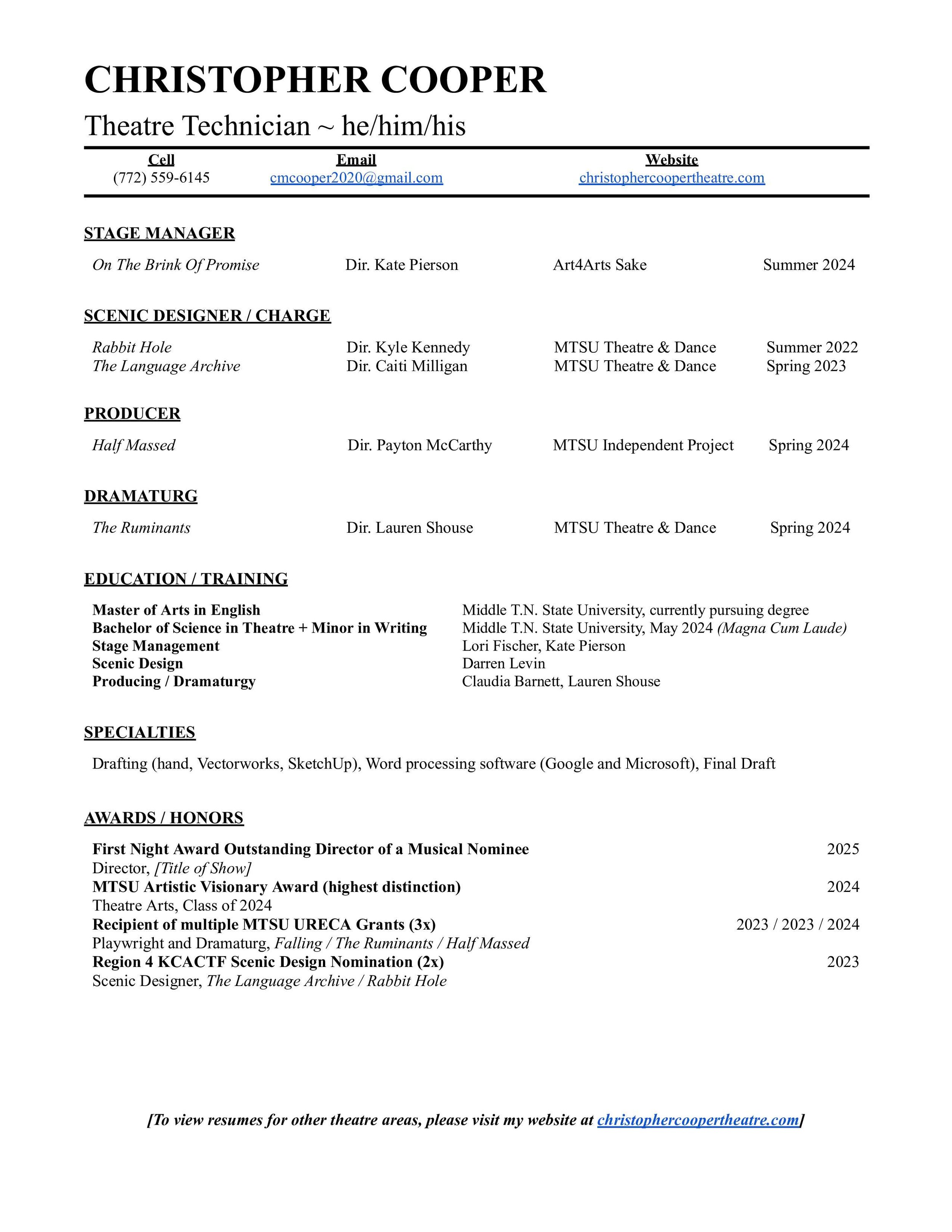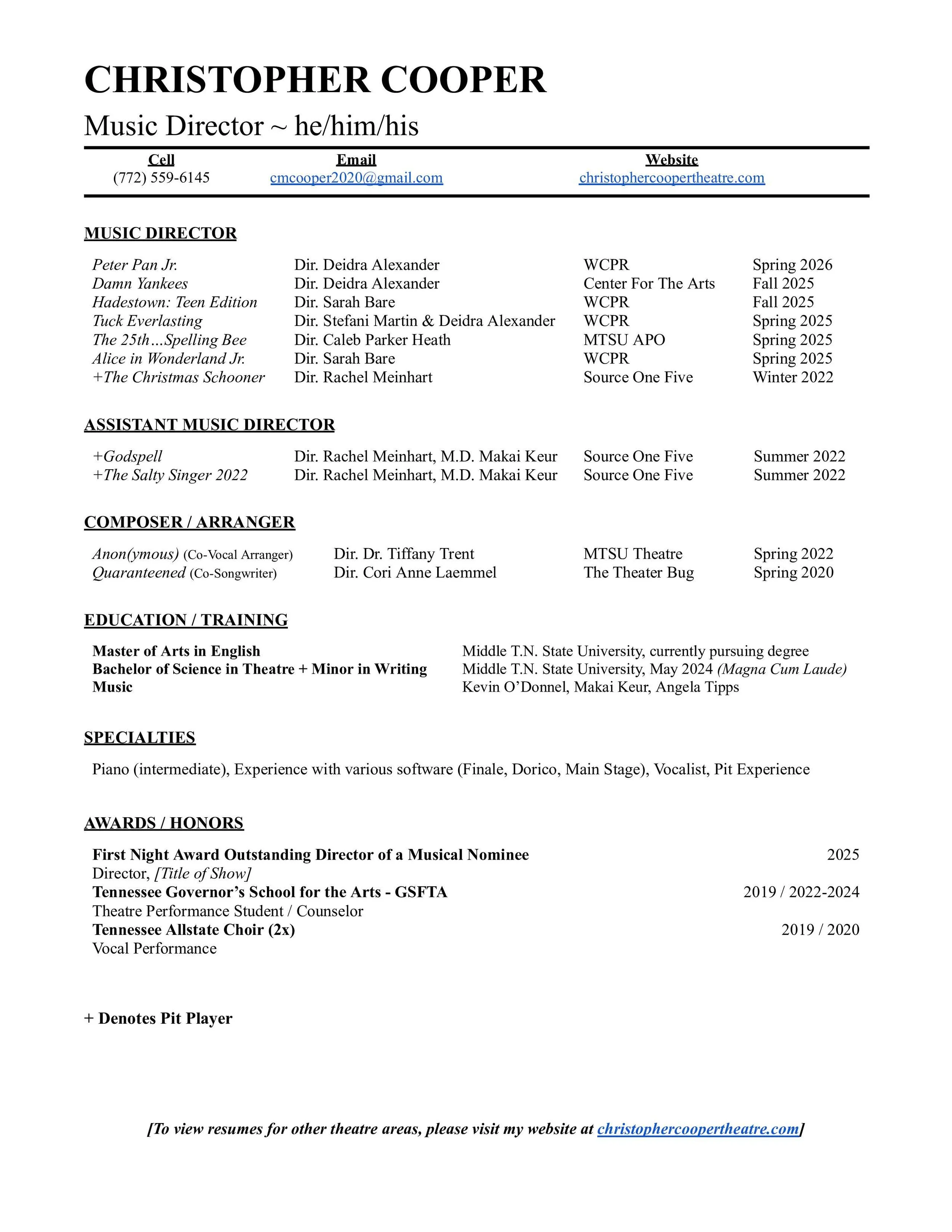 Resumes & Headshots Directing ResumeCLICK TO DOWNLOAD Performance ResumeCLICK TO DOWNLOAD Music Directing ResumeCLICK TO DOWNLOAD Playwriting / Dramaturgy ResumeCLICK TO DOWNLOAD Technician ResumeCLICK TO DOWNLOAD